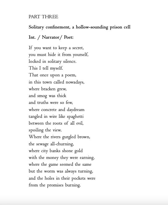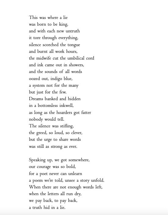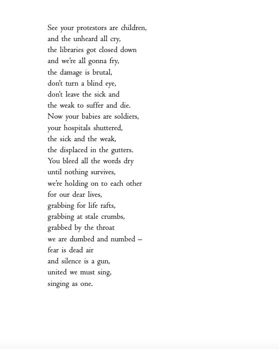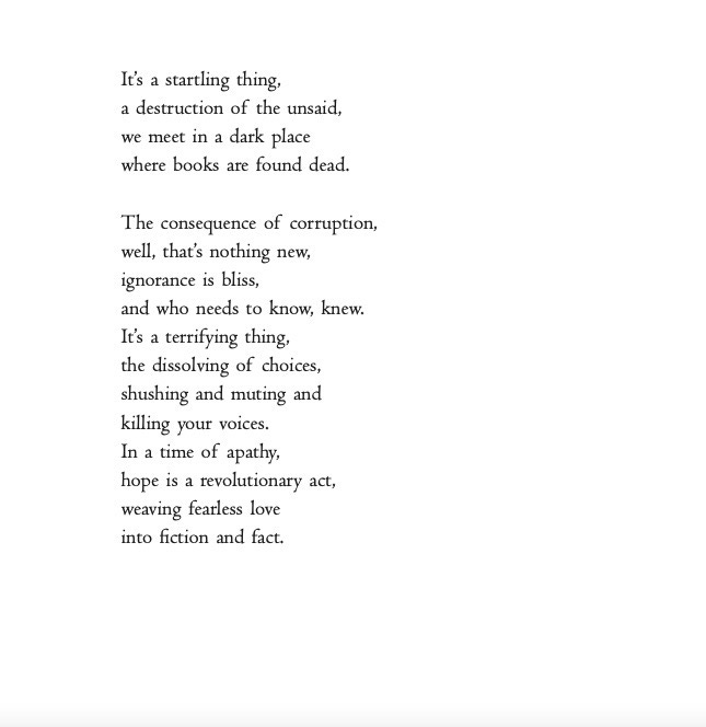 This work began life as a commission written some years ago for a BBC radio programme co-presented with the poet Kate Fox. When I was editing ‘With Love, Grief and Fury’ I read old notebooks and found all this extra writing I had done in this 2084-world which was not aired or used in the finished BBC broadcast. It seems the younger me had deeply imagined a terrifying Orwellian tale, a world of dead books, the horror of the muting of peace keepers and poets, the silencing of lovers and writers, and the monetising of dreams. It was a world which is not so very different from the times we are witnessing now and today. We can all see books burning in Gaza and the destruction of Palestinian libraries and universities. We are all noticing the shadow banning and censorship of our posts on social media platforms. We are all reading about AI and how our words, dreams, art and creations can be mirrored and replicated. We walk around with our Big Brother surveillance in our pockets. We are seeing books being banned. Always be sure to read the banned books, share the banned books. This is a most challenging time to be an artist, to be a poet, to write books, and to be in the business of sharing a truth of what it is to be a human.